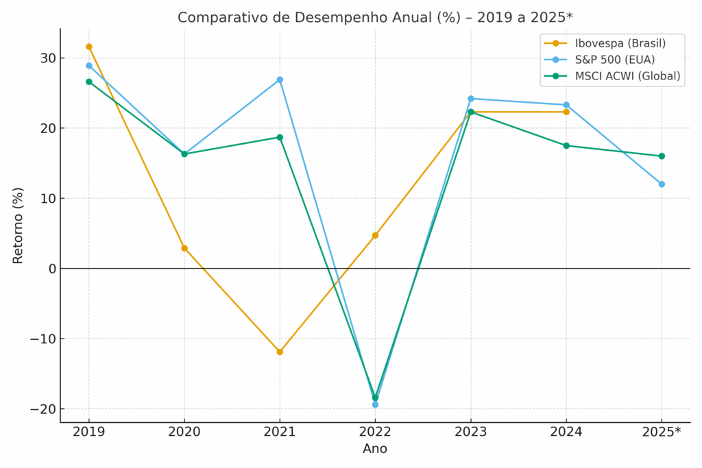 Investir em ETFs globais em 2025 é uma das formas mais inteligentes de sair do “Brasil-only” sem complicar sua vida. O desempenho recente comprova a força dessa estratégia: em 2024, o IVVB11, que replica o S&P 500 em reais, rendeu mais de 58% ao combinar a alta das bolsas americanas com a valorização do dólar.